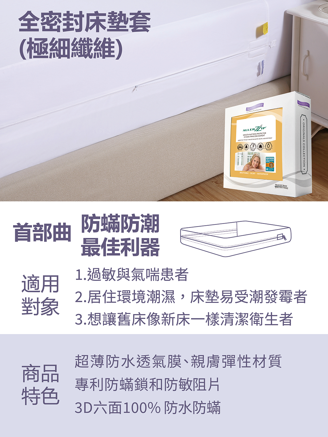※註:經 AAFA 美國氣喘與過敏協會適用認證,美國寢之堡 Allerzip全密封拉鍊式床墊套(全包式保潔墊) 與全密封枕套系列產品可有效阻隔過敏原、降低氣喘與過敏發生的機率。